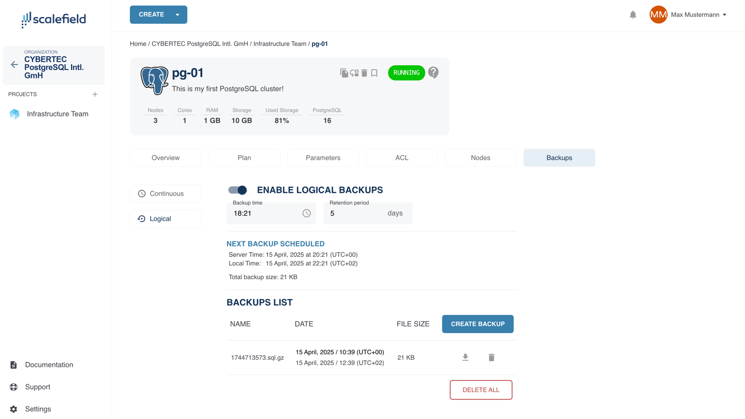Logische Backups in Scalefield werden mit pg_dump erstellt und in einem lokalen S3-Bucket gespeichert.