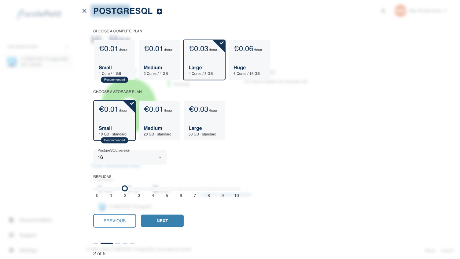 Im nächsten Schritt konfigurieren Sie die Ressourcen des Dienstes, wählen die PostgreSQL-Version aus und legen die Anzahl der Replikate fest.