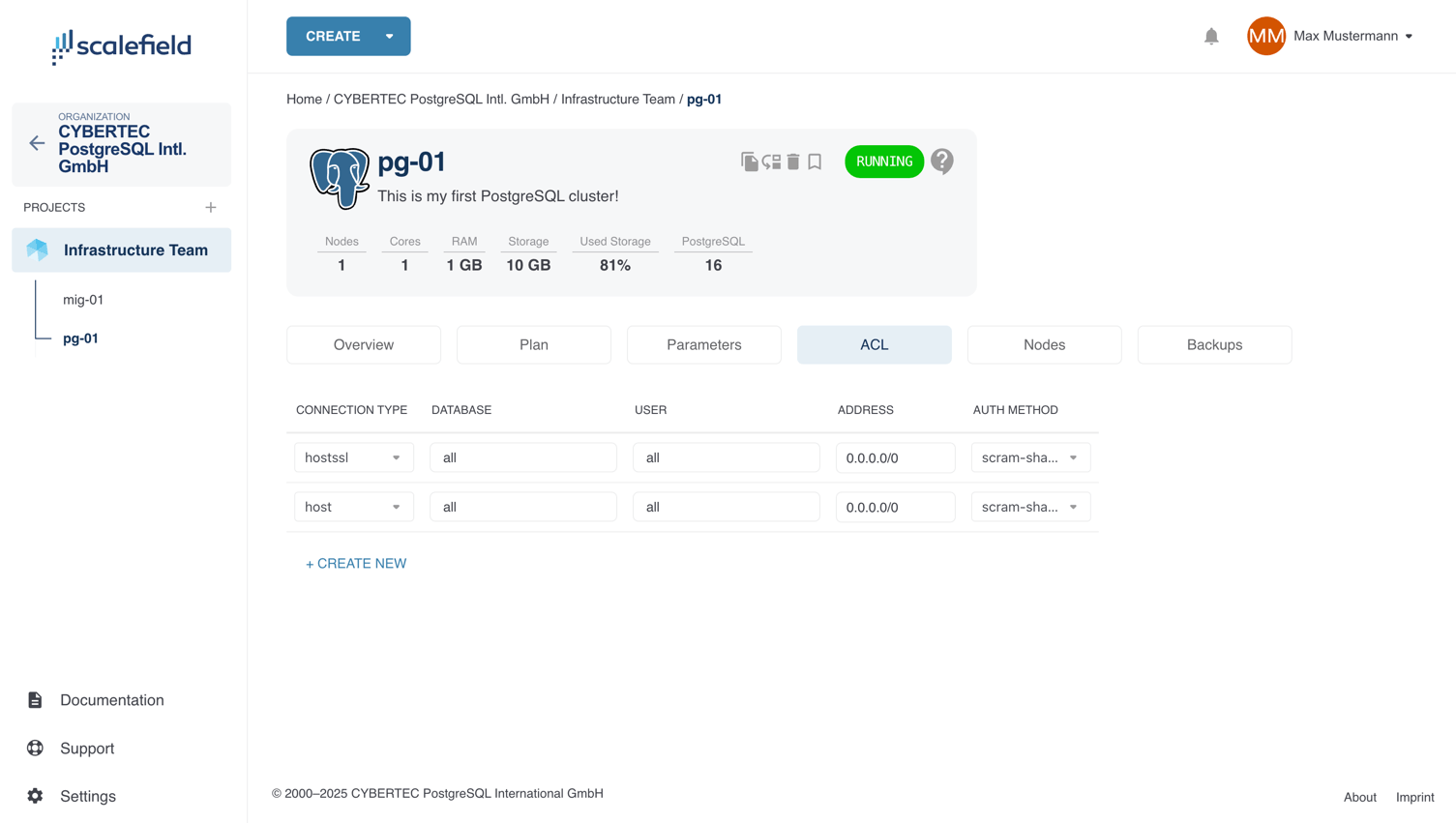 Sie können pg_hba-Einträge für eine Datenbank jederzeit verwalten, d. h. erstellen, bearbeiten, neu anordnen oder entfernen. Um auf diese Einstellungen zuzugreifen, navigieren Sie zur Serviceseite und öffnen Sie die Registerkarte ACL.