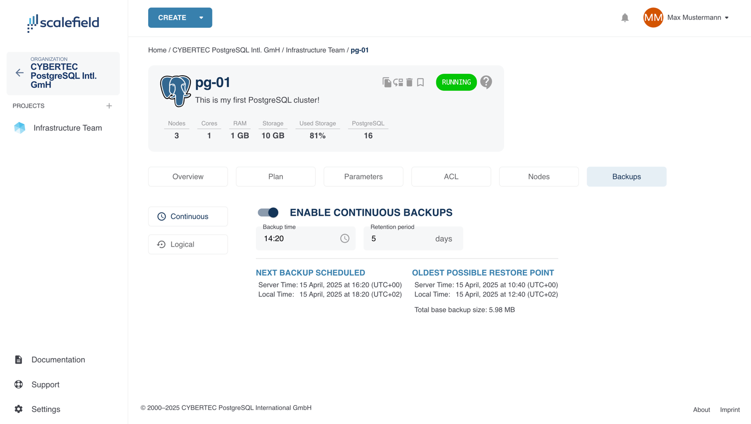 Continuous backups in Scalefield use an incremental approach starting from a base backup, followed by continuous archiving of WAL (Write-Ahead Log) segments, enabling point-in-time recovery (PITR), which is required for the Create from Backup feature. To access these settings, navigate to the service page, open the Backups tab, then select the Continuous section.