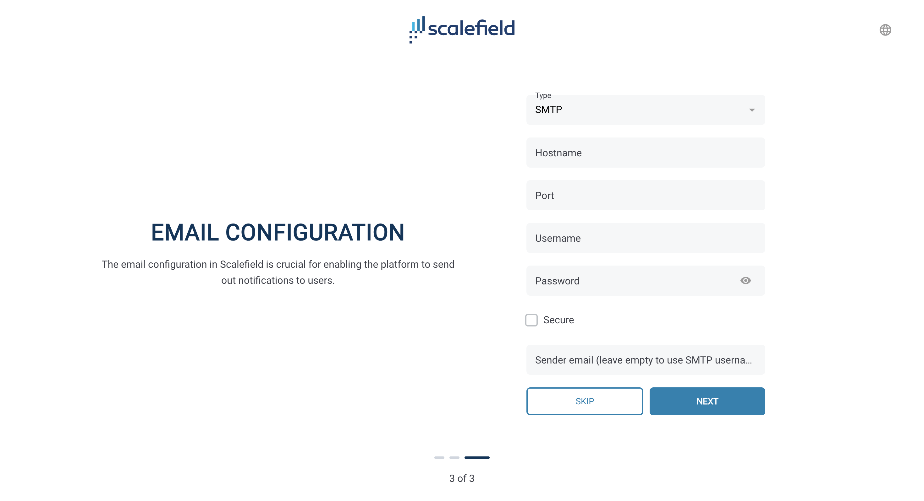 The third and final step of the setup wizard involves configuring email settings. This enables Scalefield to send notifications to users about relevant events and system activity.